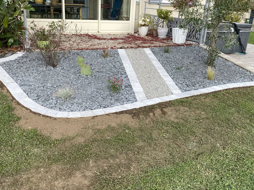 AUDOUARD Paysagiste, votre expert en aménagement extérieur à Saint-Galmier, est fier de vous présenter sa dernière réalisation : la création de massifs à Saint-Galmier. Ces massifs, soigneusement conçus et réalisés, sont bordés de bordures en pavés et recouverts d'éclats d'ardoises ou de balastre , offrant ainsi une esthétique unique et durable. Pour assurer un entretien minimal et éviter la prolifération des mauvaises herbes, une pose de bâche a été intégrée. Les plantations choisies viennent parfaire l'harmonie de l'ensemble.