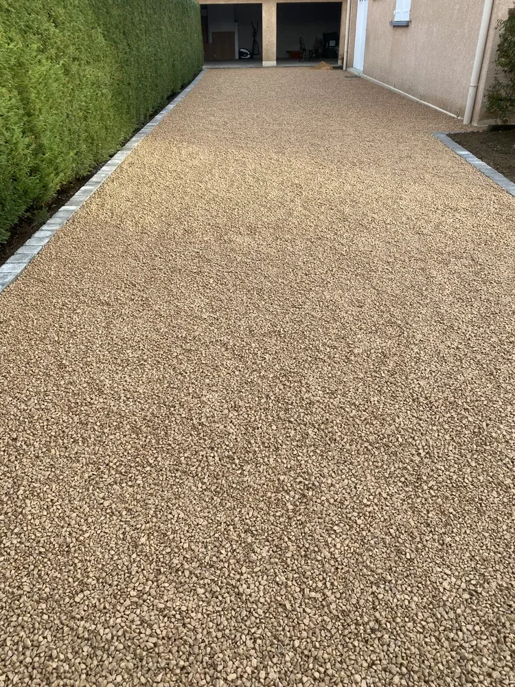 Chez AUDOUARD Paysagiste, nous sommes fiers de vous présenter notre dernière réalisation : une magnifique cour en gravier coloré avec des pavés soigneusement posés en delimitation dans une commune des Veauche Cette réalisation témoigne de notre expertise en aménagement extérieur et de notre engagement à offrir des solutions esthétiques et durables à nos clients.